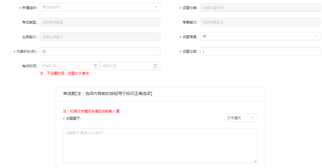 试题题干和选项支持文本和富文本两种编辑方式。输入试题属性后,点击'确定'。