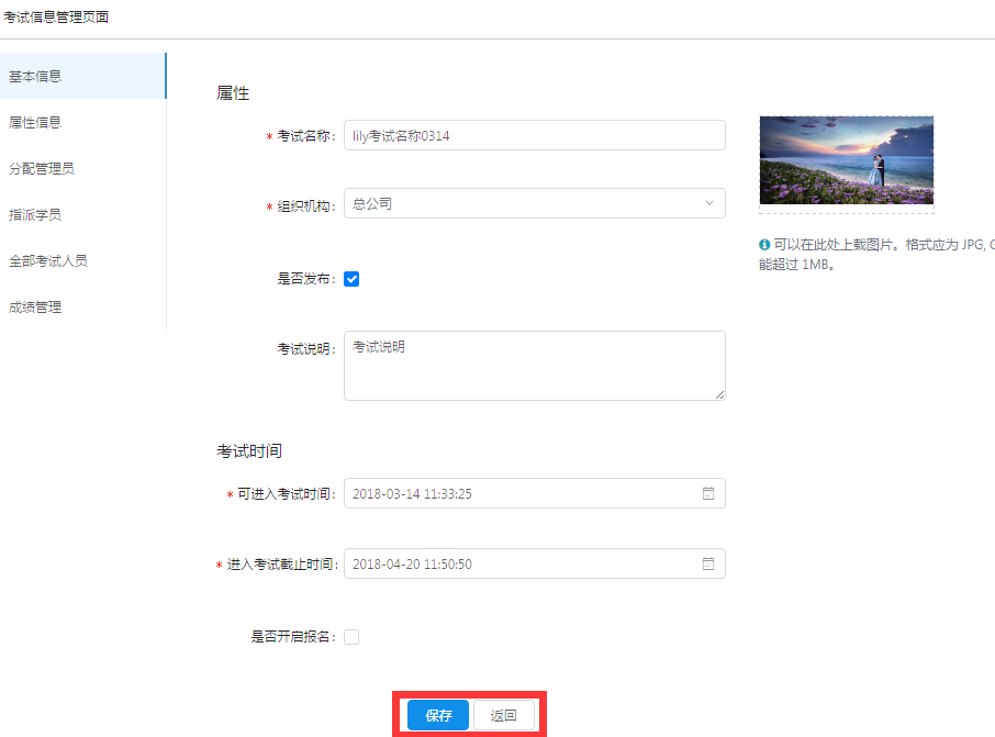 编辑考试的基本信息,包括考试名称、所属机构、封面图片、是否发布、考试说明、可进入考试时间、进入考试截止时间、是否开启报名等。