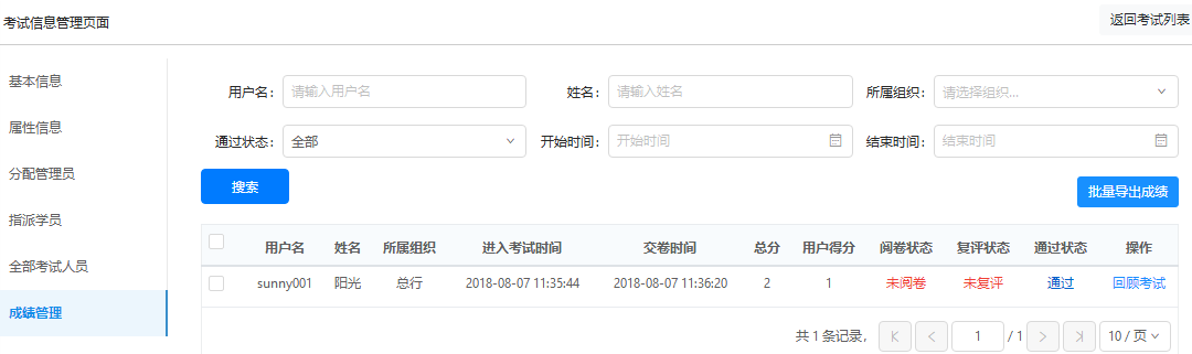 查看当前考试的考生考试成绩,包括用户名、姓名、所属机构、进入考试时间、交卷时间、总分、用户得分、阅卷状态、复评状态、通过状态、操作等。