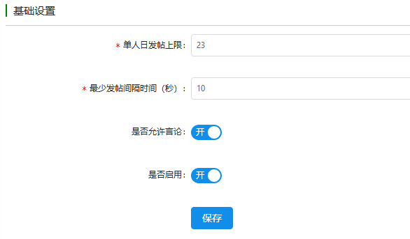 基本设置页面可以设置站点论坛的开放、发贴时间频率。