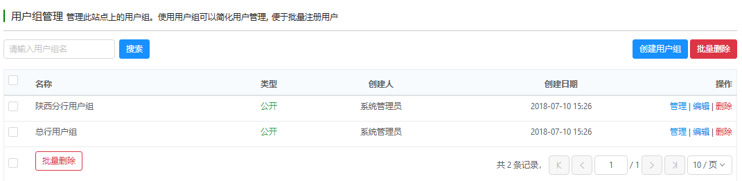 点击一级菜单"组织管理",展开二级菜单。点击'用户组管理',进入用户组管理列表。