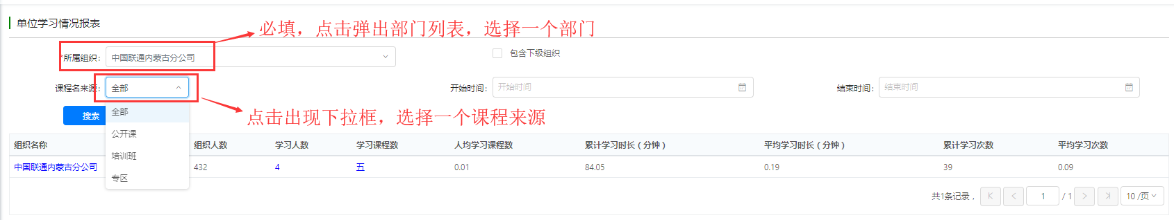 搜索时所属组织为必填,课程名称、开始时间、结束时间为选填。