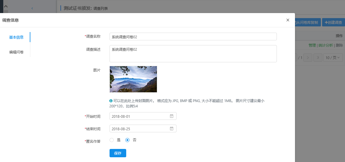 点击'创建调查',进入调查问卷属性页面,输入必填项,点击'保存',再继续编辑问卷题目。