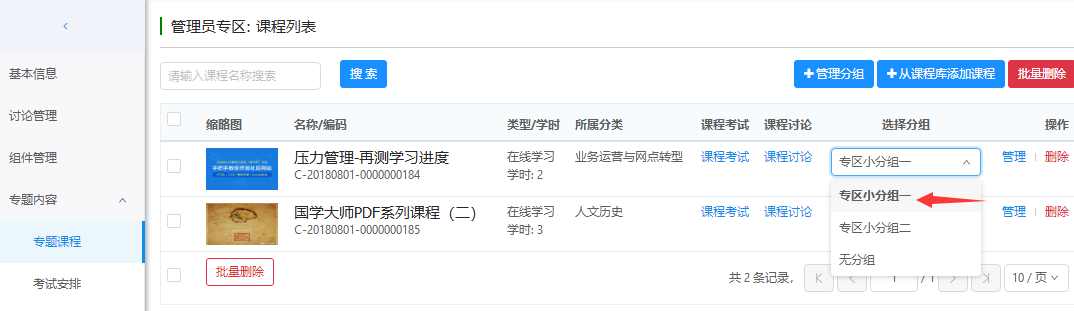 分组维护后,可以在课程列表中,展开选择分组,为专区中的课程指定分组。