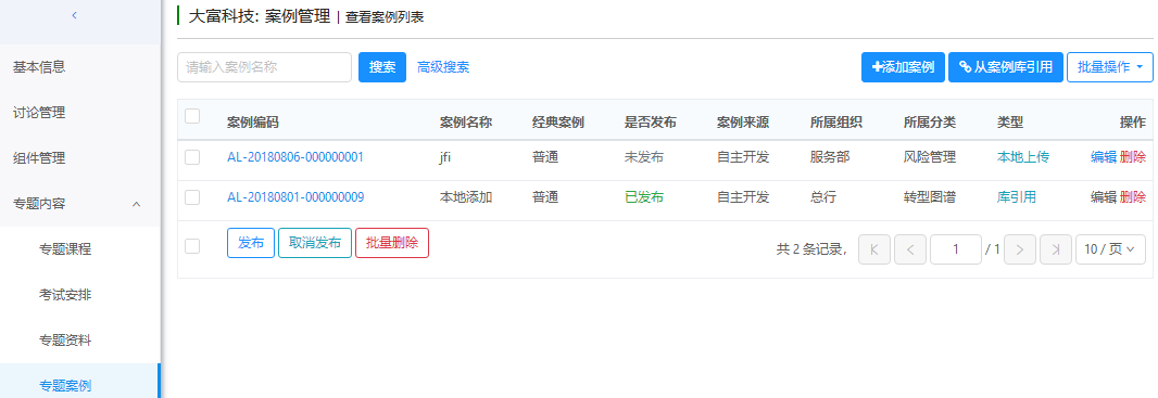 支持案例的添加(本地上传、从案例库引用)、编辑、删除等操作。